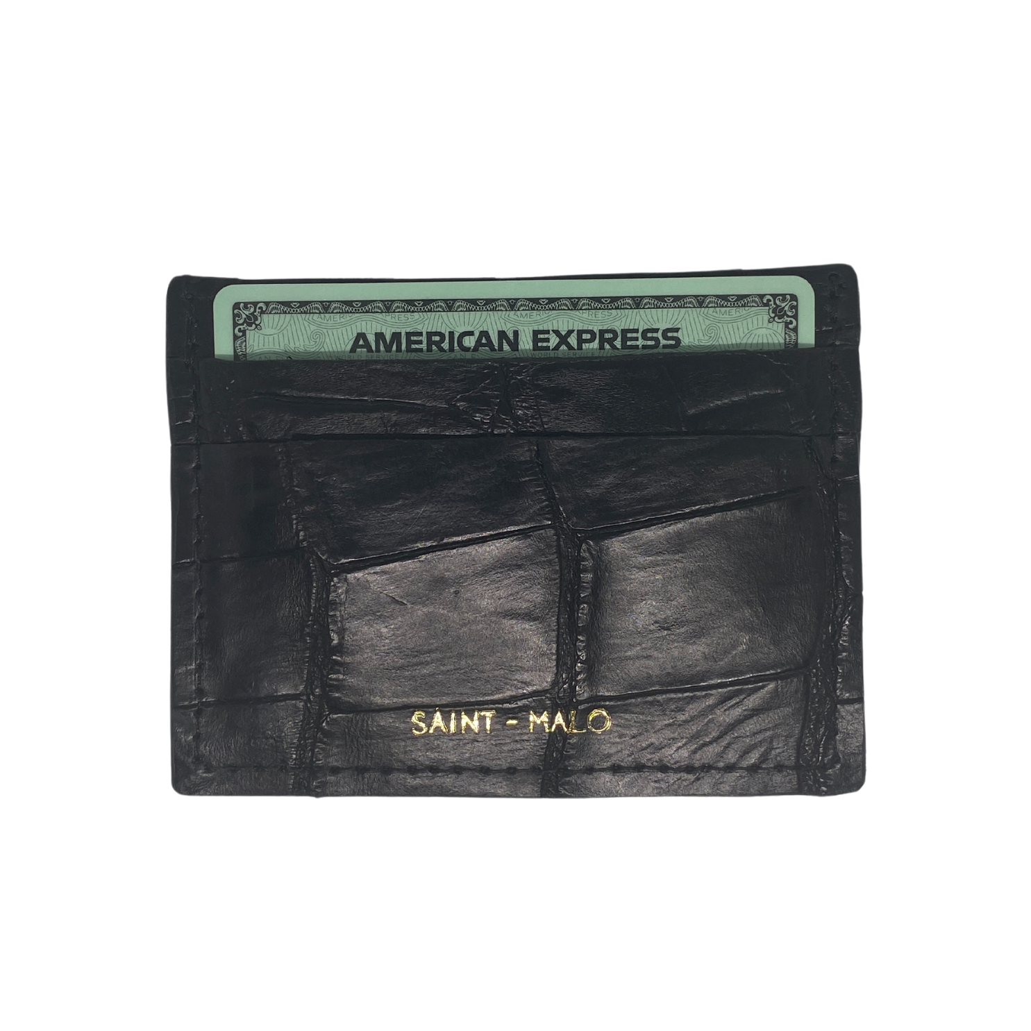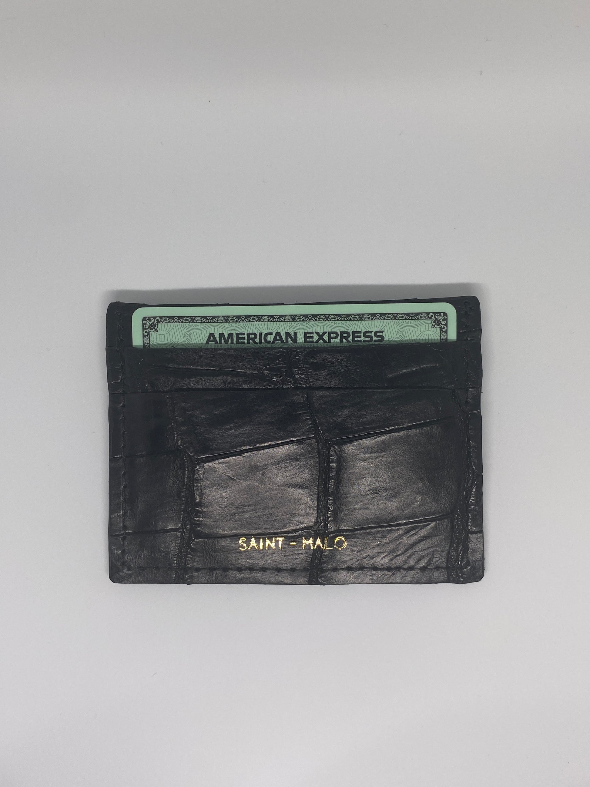 Este hermoso tarjetero tiene dos espacios de cada lado para tarjetas y también espacio para billetes. Es cocodrilo genuino, huele delicioso, y es grabado en oro.